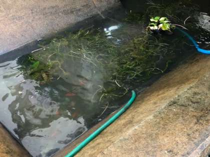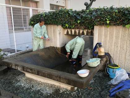 本日、管理作業員のお二人と坂元先生が運動場の池の水を全部抜いて、掃除をしてくださいました。池の中には金魚とメダカがいるのですが、棲み分けできるように、コンクリートブロックで境も作ってくださいました。本当にありがとうございました。
