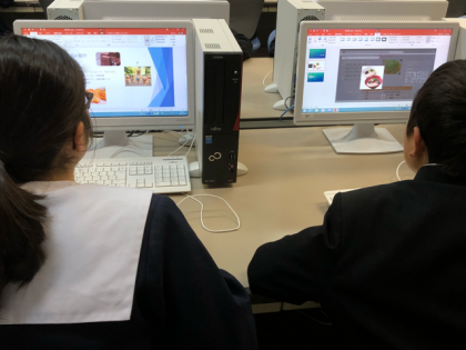 授業でパワーポイントの使い方を覚えることで、2年生は今週末の校外学習について、各班でパワーポイントを使っての発表を、海外からの留学生に対して行います。使いこなせるように、しっかりと学習しましょう。