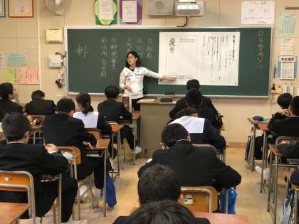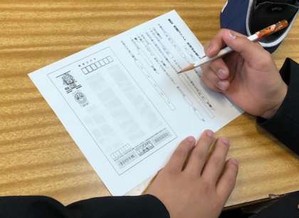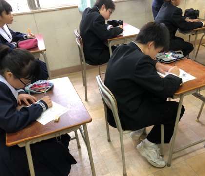 1年生の書写の授業では、新年を前に、「年賀状を書こう!」という授業を行なっていました。今までの学習を生かして、楷書と仮名を調和させ、配列に気をつけながら丁寧に書くことを学んでいました。