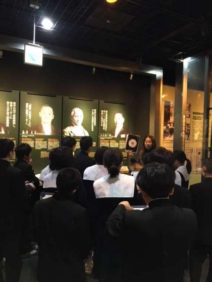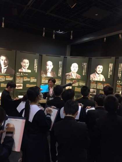 ここでは大阪に所縁のあるさまざまな企業家について係りの人から説明を受けて、大事なことはメモを取りながら学習しています。