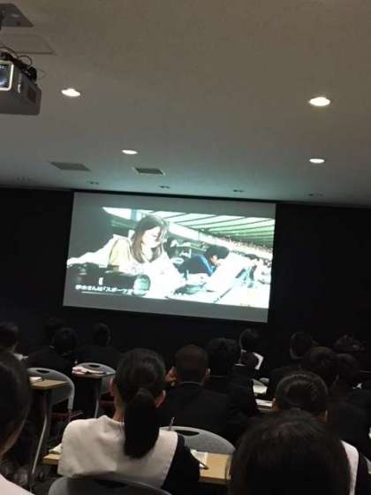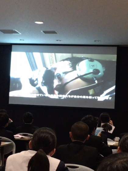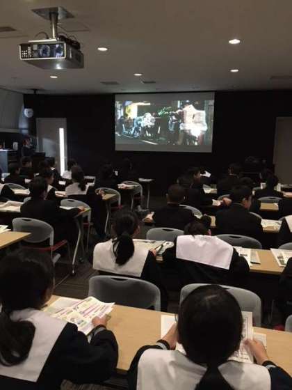 工場見学を終えて、新聞ができるまでのお話を聞いています。