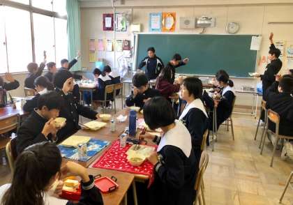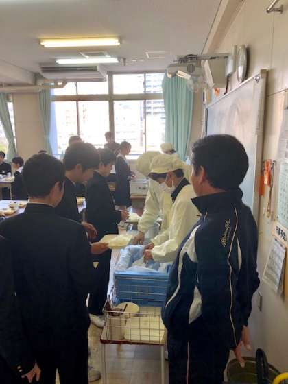 本日12月14日(金)の給食の時間、2年生のクラスにお邪魔して、配膳の様子や食べている様子を見せていただきました。
