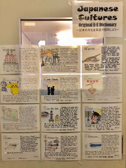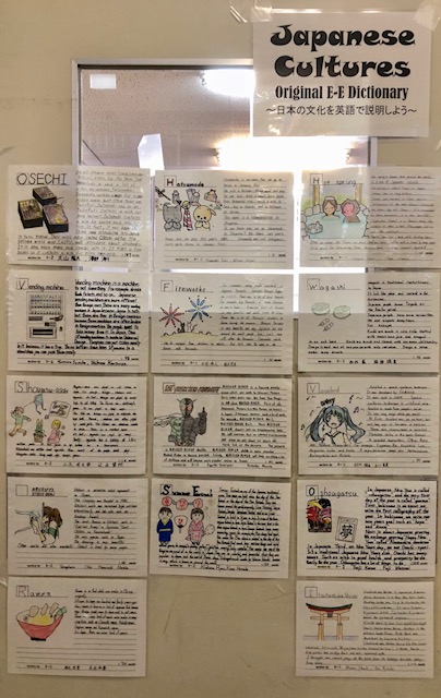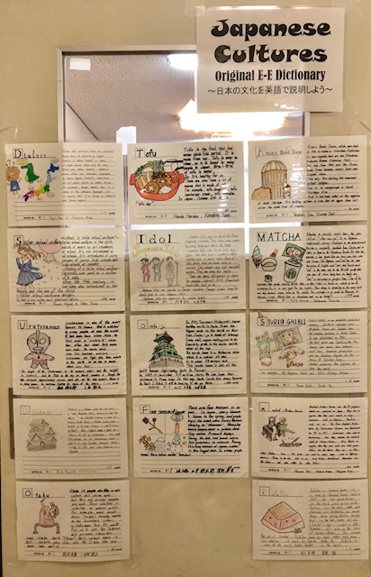 3年生の英語科の授業で作成していた「Original English-English Dictionary 」〜日本の文化を英語で紹介しよう〜が完成し、各クラスの廊下側の扉に掲示されています。それぞれ力作ぞろいです。