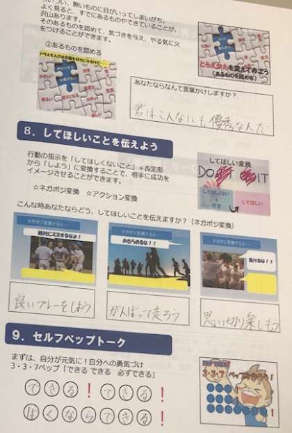 ペアで活動したり話し合ったりしながら、ネガティブな声かけからポジティブな声かけにするにはどのような声かけをしたら良いのかを自分達で考えました。