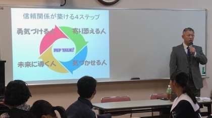 スポーツの現場でどのようにペップトークを用いて選手に声をかけているのか、実際の映像を見せていただき、どのような声かけが有効なのか学びました。
