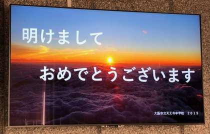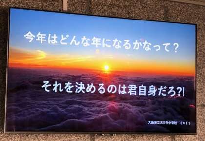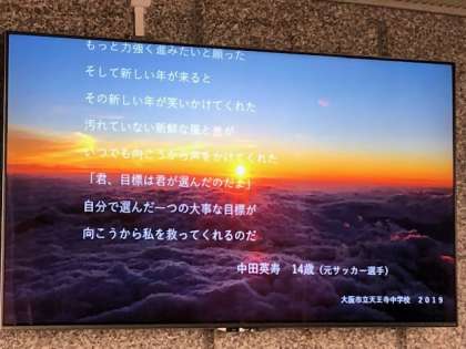 玄関の天中ビジョンに14歳の時の中田英寿さん(元サッカー選手)の言葉が載せられています。新年にあたり目標を立て、その目標に向かって頑張っていきましょう。