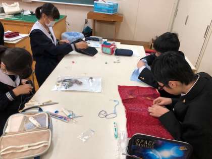 1年生の家庭科では、「きんちゃく袋」を作っています。2学期に各自が自由にデザイン・色を考え、刺し子をしています。難しい曲線をきれいに縫っている生徒もいました。