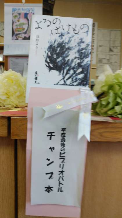 みんな一生懸命に発表し、ユニークな質問や答えも飛び出し、笑いに包まれた回となりました。決選投票の結果、2年生図書委員が推薦した、「よるのばけもの(住野よる)」がチャンプ本となりました。参加してくださった先生方や生徒の皆さん、ありがとうございました。