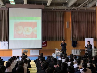 虫歯や歯垢についてのお話や虫歯ににならないための歯のブラッシング方法、歯ブラシの交換時期など、大切な歯のケアに役立つお話をしていただき、生徒たちも手鏡を片手に自分の歯を見ながら真剣に聞いていました。