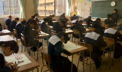 2月26日(火)1,2年生は学年末テストの2日目。本日は数学・社会・音楽のテストが行われています。学年最後のテストに、みんな真剣です!