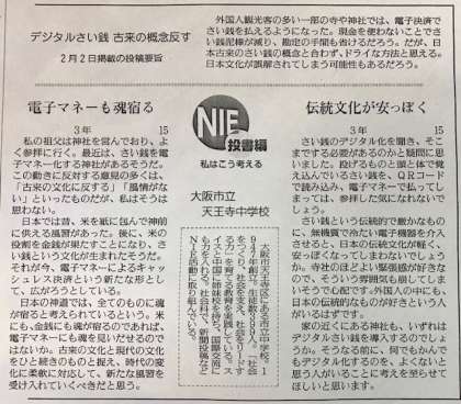 今回は「外国人観光客の多い一部の寺や神社では、電子決済でさい銭を払えるようになった。」ことについて、どのように自分は考えるのかを投書しました。賛否一つずつの意見を掲載していただきましたが、どちらの意見も「さすが天中生!」といった内容です。 よく頑張りました!