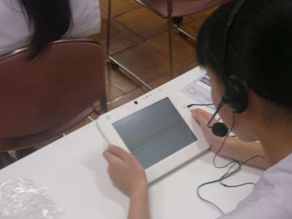 多目的室で行われたスピーキングテストでは、専用のタブレットを使いながら一生懸命話していました。