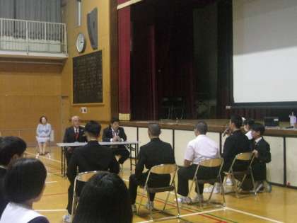 当日は、校区内にある興国高等学校より草島校長先生をはじめ先生方や在校生が来校してくださり、面接のコツをわかりやすく説明してくださいました。