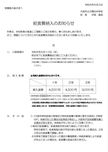 本日、お子さまを通じて「給食費納入のお知らせ」を配布しております。