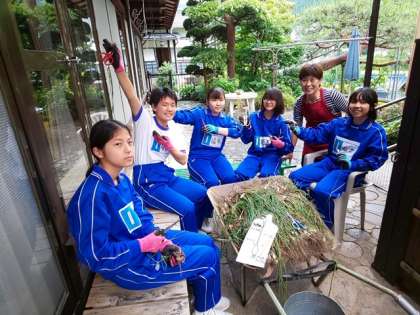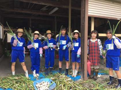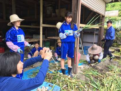 らっきょの仕分けや根と茎をカットする作業をお手伝い。