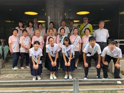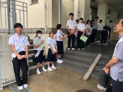 地域の保護司の皆様、更生保護女性会の皆様がお越しになり、生徒会や風紀委員と一緒に挨拶活動をしてくださいました。