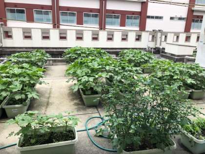 2年生の技術の授業で植えたオクラがぐんぐん成長中です。