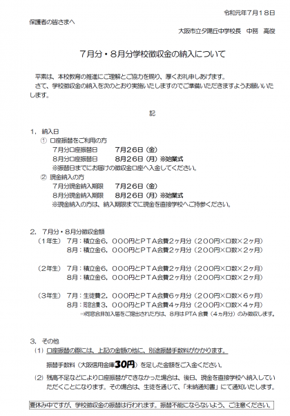 本日、お子さまを通じて「7月分・8月分学校徴収金の納入について」のお知らせを配布しております。