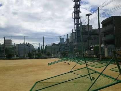 夕中でも台風に備えて、防球ネットを倒すなどの対策をしています。