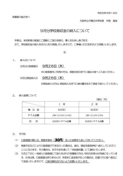 9月分学校徴収金の納入について