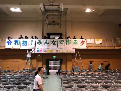 文化祭実行委員によって体育館にスローガンが飾られました。