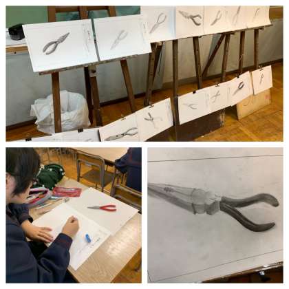 前回と比べると色は積極的にのせれるようになってきました。金属の部分とゴムの部分の質感の差に苦戦しましたが、40分で存在感のあるデッサンが仕上がるようになり、成長が見られました。
