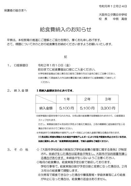 1月給食費納入のお知らせ