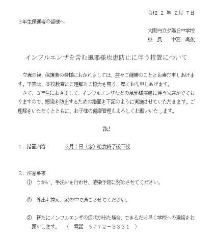 3年生におきまして、インフルエンザなどの風邪様疾患に伴う欠席がでてきておりますので、感染を防止するための措置を下記のように実施させていただきます。