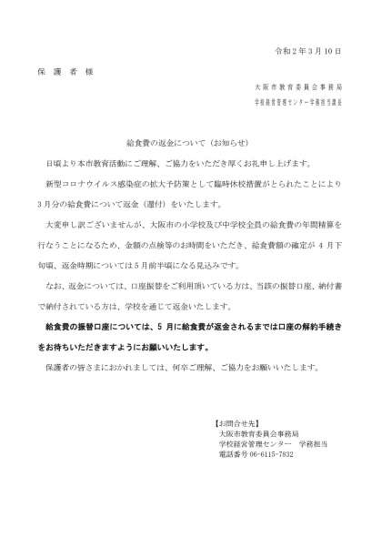 給食費の振替口座へ返金を行いますので、5月に給食費が返金されるまでは口座を解約されませんようお願いいたします。