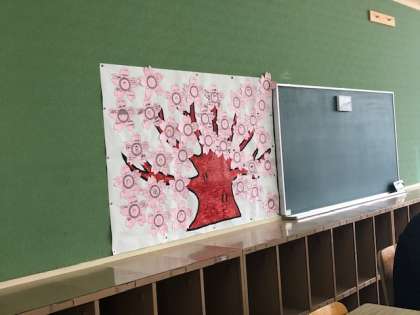 教室には自己紹介カードの桜が掲示され、教室が彩られています。