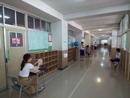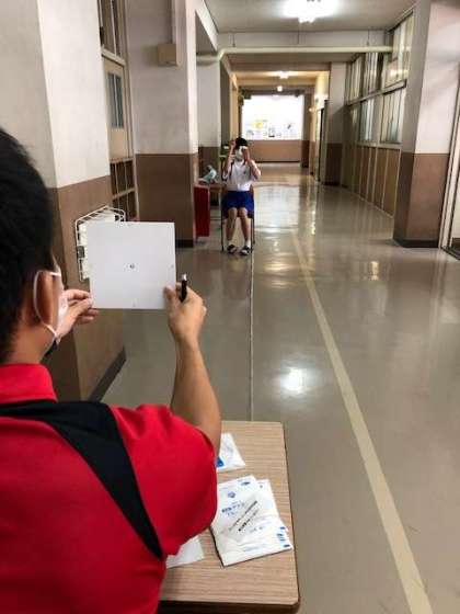 感染症対策として、タオルかティッシュで目を覆って検査しました。