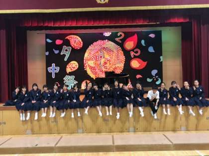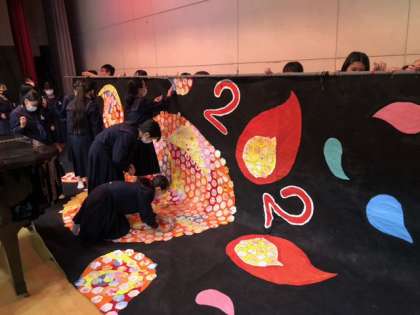 会場設営が終わった後は美術部が背景画の取り付け作業をしました。