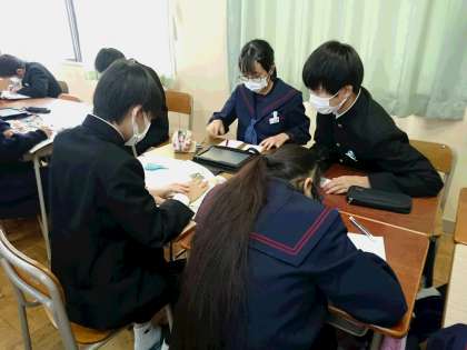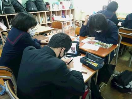 教室でもタブレットや本を使って、班で協力して調べ学習を行いました。