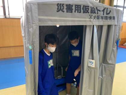 災害用仮設トイレ、可搬式ポンプ、起震車、救命の体験をしました。