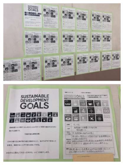 それぞれが調べた企業の取り組みが3年生のフロアの廊下に掲示されています。