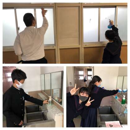 各委員会活動の様子です。 美化委員は、教室の窓吹きやトイレの石鹸の補充を行いました。