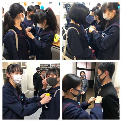 生徒会役員から、胸にコサージュをつけてもらいます。