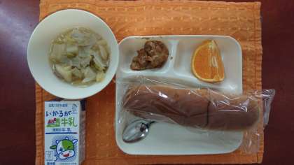 【今日の献立】 鶏肉のみそソース スープ煮 デコポン 黒糖コッペ 牛乳