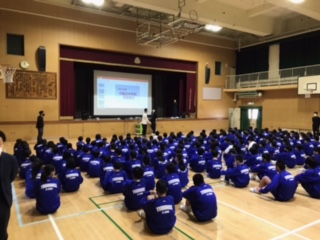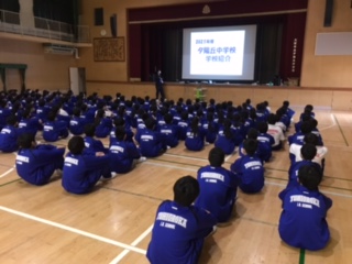 1年生は4時間目に、体育館で学校紹介の映像を見ました。