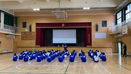 3年生、体育の授業の様子。 1年間体育を受けるにあたってのガイダンスの説明を受けています。