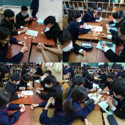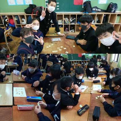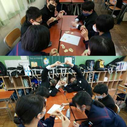 次に出会いと協力ということで、さんれもの冒険というゲームに挑戦しました。班の全員で協力しないと完成しないゲームで、コミュニケーション力が試される少し難しいゲームです。新しいクラスであまりしゃべったことのない仲間とも協力しながら、ゲームに取り組み、たくさんコミュニケーションをとることができました。