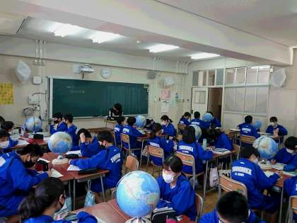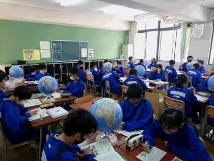 1年生社会科の授業の様子です。本時は地球儀を使って先生が指示する国や都市を探しました。