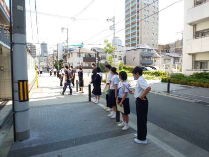 風紀委員さんと教育実習の先生が門で気持ちよく挨拶をしてくれています。