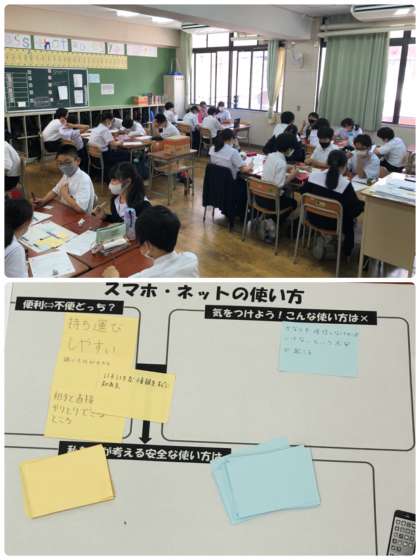 6時間目は班に分かれ、スマートフォン・インターネットの使い方についての便利なこと不便なこと、いけない使い方、安全な使い方はどんな使い方かなどを話し合いました。