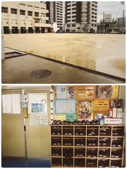 午前中の雨で運動場には水が浮き、外にでることができません。