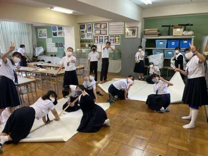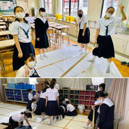今日は音楽コンクールの背景画を作成しました。模造紙をつなぎあわせました。どんな作品ができあがるか楽しみです。
