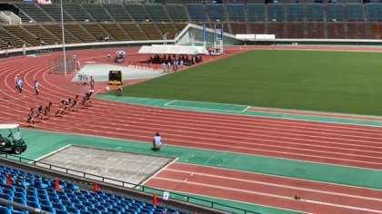 近畿中学総合体育大会が神戸ユニバー競技場で行われ、1年男子100mに出場しました。
