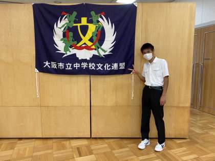 大阪市立中学校文化連盟旗の前で記念撮影です。