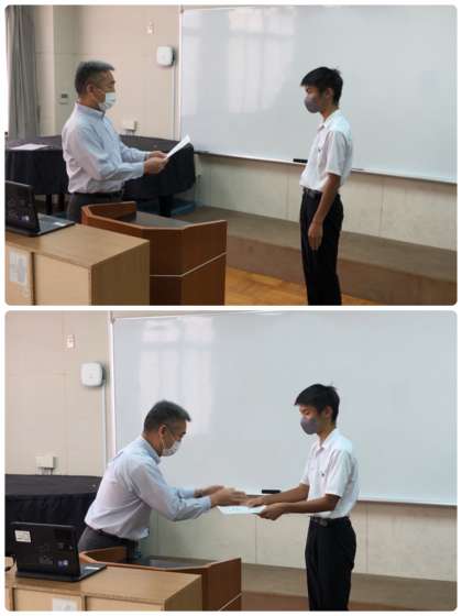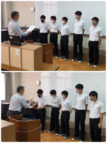 一昨日、大阪市長杯中学生英語暗唱大会に出場した3年生1名と大阪中学校総合体育大会(大阪府)で第5位となったバドミントン男子団体の部について、校長先生より賞状の伝達がありました。