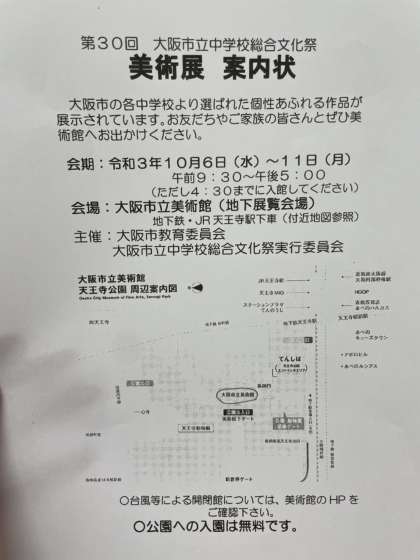 大阪市の中学校より選ばれた作品が大阪市立美術館に展示されます。夕陽丘中学校からは3学年合わせて34点の作品が展示されています。お時間ありましたらぜひ美術館へお出かけください。